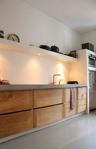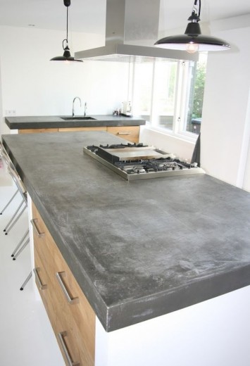 Light beton wordt in een fabriek in een mal gegoten en moet zo’n twee tot drie weken uitharden. Daarna wordt het gepolijst en voorzien van een coating, en hup het kan zo op de keuken gelegd worden. Het blad is ook nog een in verschillende grijstinten en heel veel diktes verkrijgbaar, dus voor ieder wat wils.