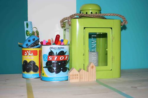 En ook in mijn interieur heb ik artikel die ooit voor iets anders een doel hadden. Zo heb ik in mijn kantoor/ knutselkamer van de kinderen oude olijfblikken staan waar lekkere zwarte olijven in gezeten hebben.