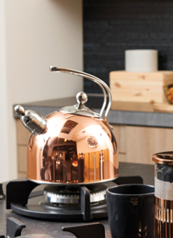 Koper is hot en helemaal in! Haal deze woontrend in huis met bijzondere eyecatchers zoals de schitterende koperen fluitketel of prachtige theepotten van Bredemeijer. Door de gemoedelijke uitstraling en warme kleur voelt je woning meteen gezellig aan. Zorg voor een luxe uitstraling door het sprankelende koper te combineren met metallics zoals glimmend metaal, zilver of goud.