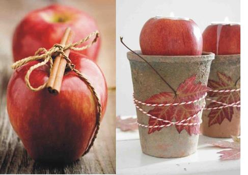 Met appels kun je ook leuk decoreren. Door een aantal kaneelstokjes op een appel met touw te knoppen of door appels gedeeltelijk uit te hollen. Theelichtjes erin, leuk potje eronder. Potje eventueel versieren met herfstbladeren en klaar.