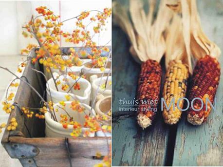 Bessentakken en maiskolven zijn ook hele decoratieve materialen. Door een aantal vaasjes of kannetjes in een decoratieve kist of mand te zetten en deze te vullen met bessentakken ontstaat er een mooi stilleven.
