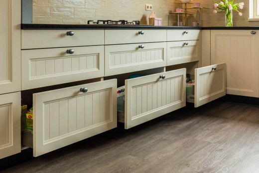 “De grote lades bieden me enorm veel bergruimte, en ik heb veel meer overzicht. Vroeger waren mijn kastjes altijd rommelig. Ik kon niet overal goed bij. Dan viel er van alles om als ik een kruidenpotje achter uit de kast moest pakken. Dat heb ik nu niet meer.”