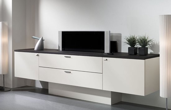 Dit is natuurlijk een prachtige oplossing. Je pakt je afstandsbediening en je televisie komt uit de kast omhoog of verdwijnt er juist weer in. De enige randvoorwaarde is dat je kast hoog genoeg moet zijn om de TV te herbergen.