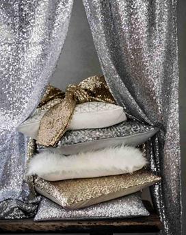Laat het interieur baden in luxe met kraakhelder wit tafellinnen en witte kussens van nepbont en kant verspreid door de rest van het huis. Het letterlijke middelpunt op de tafel is een tafelloper van gouden pailletten van H&M Home. De zacht gouden glans doet denken aan champagne, de glinstering van pailletten aan subtiele champagnebubbels.