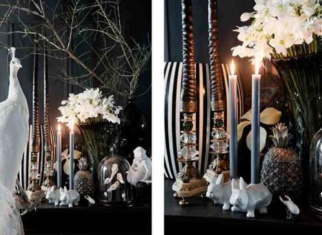 Wat nou donkere dagen? Knallen met kleur mag deze kerst! Kies één uitgesproken tint , zoals het geel op de foto (&Klevering), en combineer met trendy gouden, zilveren en koperen accessoires voor een huis waar je vrolijk van wordt! Doe net als op de foto en hang kerstballen aan visdraad aan het plafond of spuit oude kanselaars en vazen in metallic kleur voor een uitbundig en kleurrijk decor.