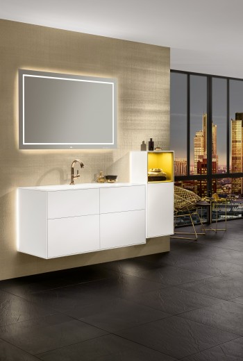 Villeroy & Boch introduceert een zeer exclusieve badkamercollectie: Finion. Een collectie met elegant keramiek, een stijlvol verlichtingsconcept en luxe meubels om eindeloos te combineren. Elke badkamer wordt uniek door de vele keuzemogelijkheden in wastafels, kasten, verlichting, glasplaten, baden en kleur. De collectie valt vooral op door de matzwarte variant met gouden details. Het vrijstaande bad met de designring, in hoogwaardig metalic-tinten chroom, champagne of goud zorgt voor een extra elegante uitstraling.