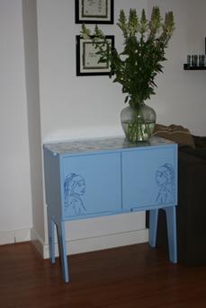 Ik vond de verf die door Histor was bijgeleverd erg fijn werken. Zowel voor het snelle werk, het lakken van het kastje, als voor het fijne werk, het tekenen van het melkmeisje, werkt de verf erg fijn. Histor had naast de 3 kleuren die ik had uitgekozen ook nog een bus witte en grijze verf bijgeleverd. De witte heb ik gebruikt als grond verf welke goed dekte ondanks dat het hout wat verf absorbeerde.