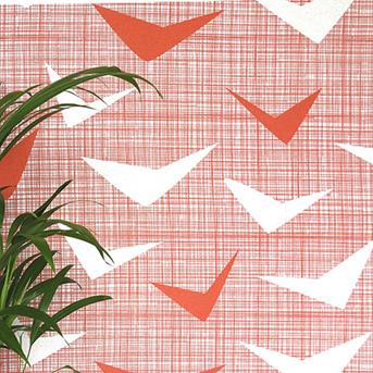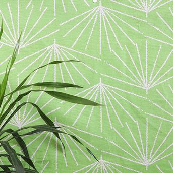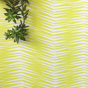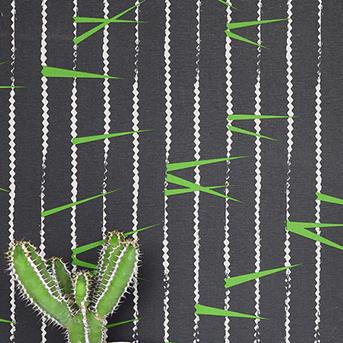 Ruwe zigzaglijnen zorgen voor uitbundige uitwaaierende bladervormen, die de belofte van schaduw en verkoeling met zich meebrengen.Airborne – in Strelitzia, Sage, en Tarmac