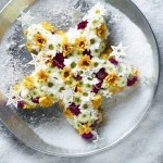 Versier een stervormig stuk steekschuim helemaal vol met enkelbloemige (wit en bronskleurig), pomponvormige (witte) en gevuldbloemige (paarse) chrysanten. Zorg er voor dat het steekschuim niet meer ziet en bestrooi met kunstsneeuw.