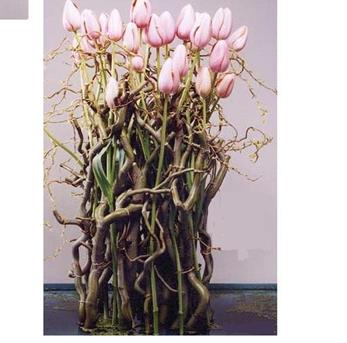 2. Voor dit idee zal je op zoek moeten naar een bosje mooie takken. Deze kan je zelf gaan zoeken in het bos maar bij de meeste goede bloemenzaken verkopen ze deze ook. Combineer de takken tot een samenhorende bos. Probeer ze aan elkaar vast te maken met hun eigen takjes. Lukt dit niet gebruik dan visdraad omdat je deze bijna niet kan zien en je hierdoor een mooier eindresultaat krijgt. Steek tussen de takjes de tulpen.
