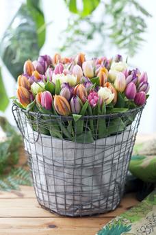 1. Zet je tulpen in een opbergmand. Vul de ijzeren opbergmand met papier. Zet onderin een blok oase of een bak die precies past. De tulpen moeten namelijk wel voorzien kunnen worden van water. Als je werkt met oase steek de tulpen dan in het oaseblok. Zorg dat de mand compleet gevuld is, eigenlijk bijna te vol, dit geeft namelijk een mooie effect.