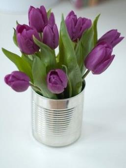 5. En dan hebben we nog een hele makkelijke en simpele manier om je tulpen op tafel te zetten. Je neemt een leeg blik welke je vult met tulpen. Je zou het blik kunnen versieren met een strikje. Met maskingtape zou je ook een leuk patroon op het blik kunnen aanbrengen.