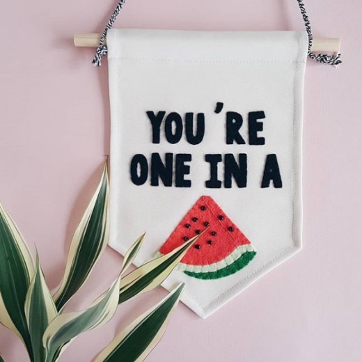 Rinske is dol op quotes en spreuken uit grootmoeders tijd. Maar omdat deze vaak iets te oubollig zijn, verpakt ze de spreuken in een modern jasje. Naast gave tegeltjes met pakkende teksten, ontwerpt ze muurvlaggen. Met teksten als ‘You’re one in a Melon‘ en ‘Hooray it’s today’ geef je de muur in een handomdraai een compleet andere look.