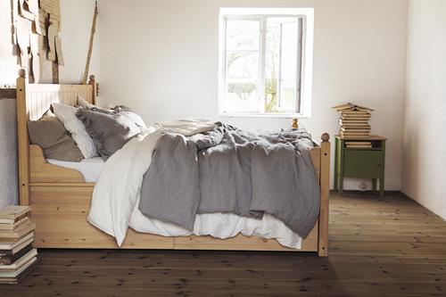 Natuurlijke materialen De slaapkamermeubels uit de HURDAL collectie omarmen de natuurlijke uitstraling van massief grenen en laten met trots hun noesten zien. Het bed creëert een warme en knusse sfeer in de slaapkamer. Bovendien bieden de lades enorm veel opbergruimte voor beddengoed of kleding.