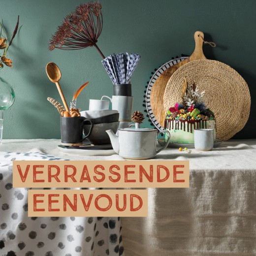 - Verrassende Eenvoud; Stel je voor: lichte en luchtig ingerichte ruimtes waarin de rust bijna als vanzelf intreedt. Een puur en zuiver gevoel, helder en fris. Verrassende Eenvoud tilt je op en laat de drukte van de dag van je afglijden. Elk item is met zorg gekozen en liefdevol gecombineerd. De materialen zijn natuurlijk. De prints eenvoudig. En de kleuren ingetogen.