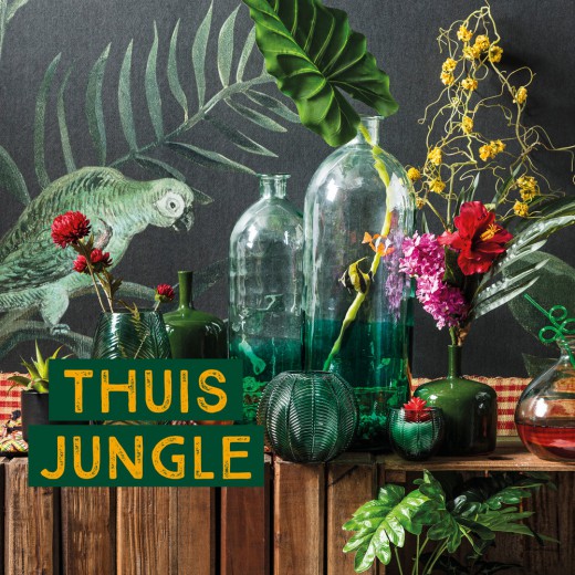 - Thuis Jungle; In de verte hoor je zachtjes een rivier kabbelen. Kleurrijke vogels fladderen fluitend boven je hoofd. Aapjes schreeuwen naar elkaar en de zon piept tussen het bladerdak door. Zelfs als je in de stad woont, waan je je met Thuis Jungle midden in de natuur. Meubels van gerecycled hout en zwart staal, weelderige (planten)dessins en stoere, grove materialen als riet, bamboe en terracotta lijken rechtsreeks uit de Amazone te komen.