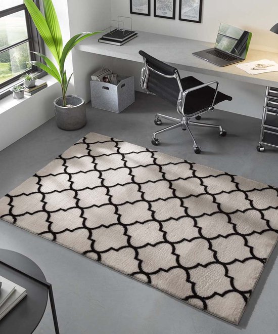 Het patroon op dit kleed zorgt voor een sjiek gevoel. En het leuke is, het vloerkleed is er met hetzelfde design ook in andere kleuren. Zo is het kleed er ook met een zwarte basis en witte lijnen.